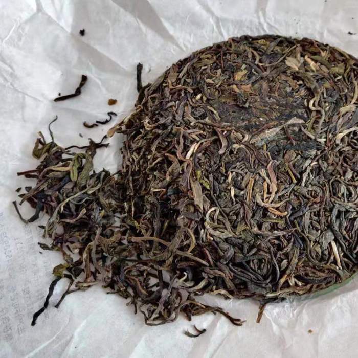 The disadvantage of loosely compressed cakes, is that it won’t hold together the leaves as good as tightly compressed ones. Especially if you store it longterm, over time the cake will become looser and looser. It’s not like the cake will fall apart, but you’ll find that leaves will fall off the cake every time you open the wrapper. Now this not much of a problem for this cake, because the leaves are fairly large. For small leaf tea cakes, you’ll hardly see cakes compressed loose.