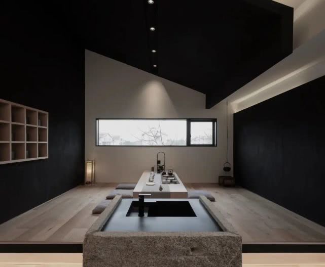 The black triangular area accentuates the original architectural sense, fading the background for a more concentrated tea moment.
