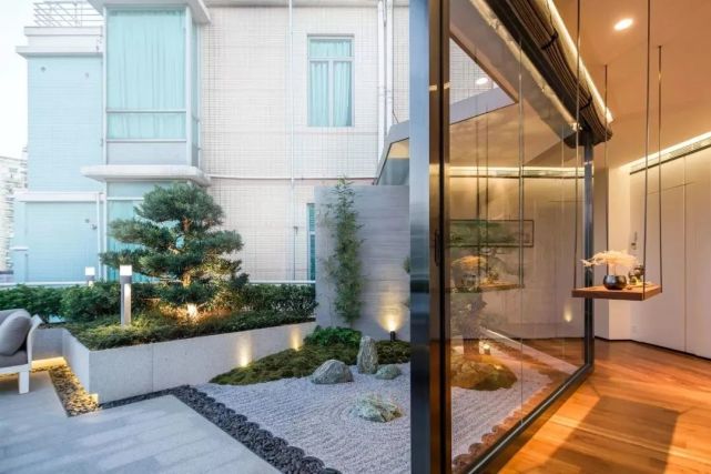 The courtyard is dotted with mosses, pine trees and ferns transported from Japan. Outdoor landscape lights shine directly from the bottom of the tree, and white walls reflect the lights and show shadows of the pine trees swaying at night.