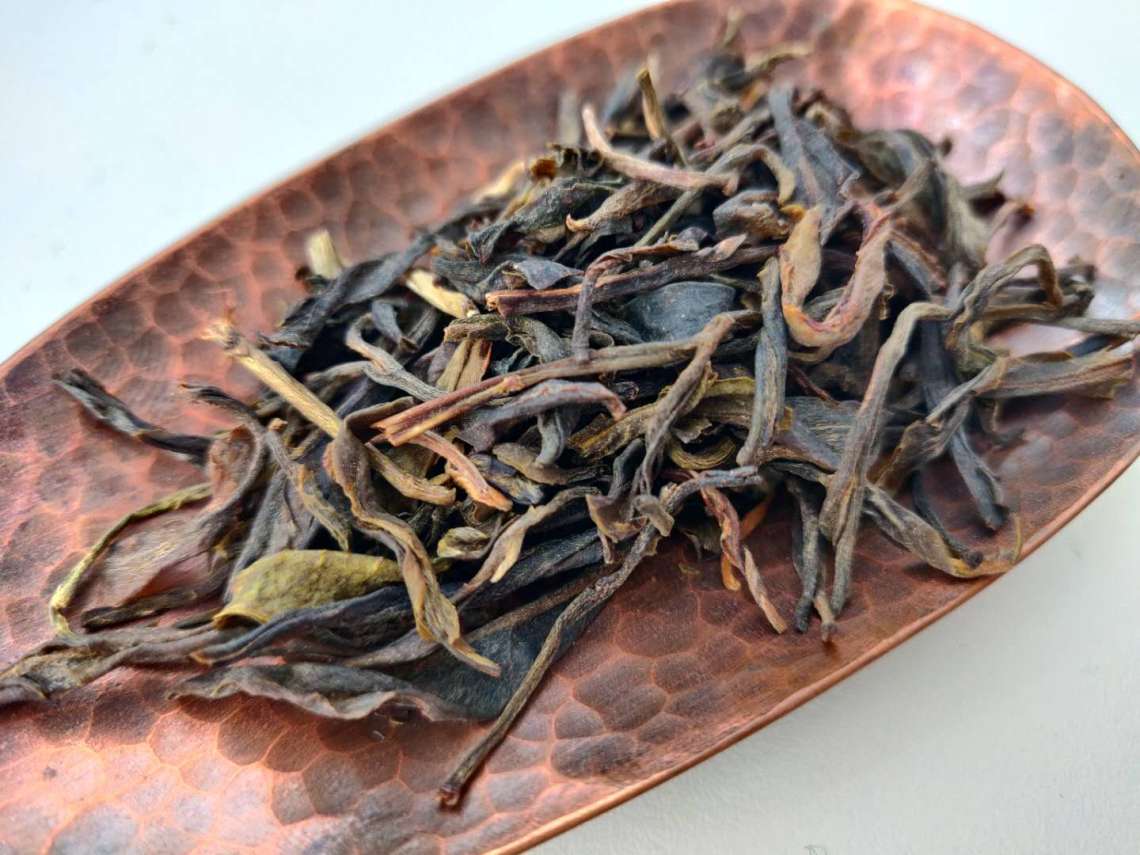 The tea soup has a dark yellow oily look, and the thickness is similar to a light oolong like Tieguanyin. The first 5 steeps very smooth, but we noticed a slight dryness in the after taste in the later steeps. Perhaps, dryness is drown out more while the steeping time is increased. We expect this to be reduced significantly in another 2 years of aging. We managed to get 9 very tasty steeps, which is a very decent yield for 4 grams of tea. Below a picture of the wet leaves.