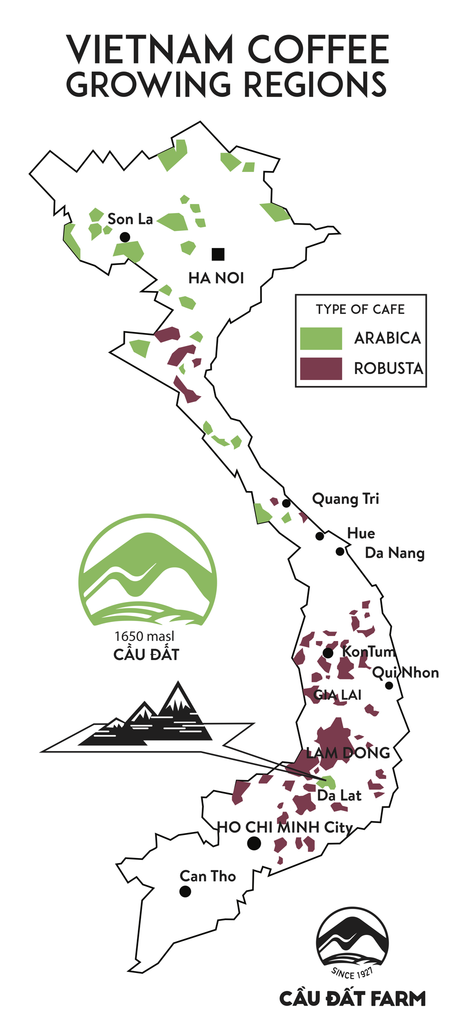 Coffee production is concentrated in just a dozen countries over the world, including Vietnam. What makes a place suitable for growing coffee? First, it has to be at least 600 meters above sea level. Then, factors like climate, wind, topography, soil, and local knowhow greatly affect the bean’s development. In Vietnam, coffee is grown in the highlands across the country. In the map below you can see where the Arabica (green) and Robusta (Brown) production regions are located.